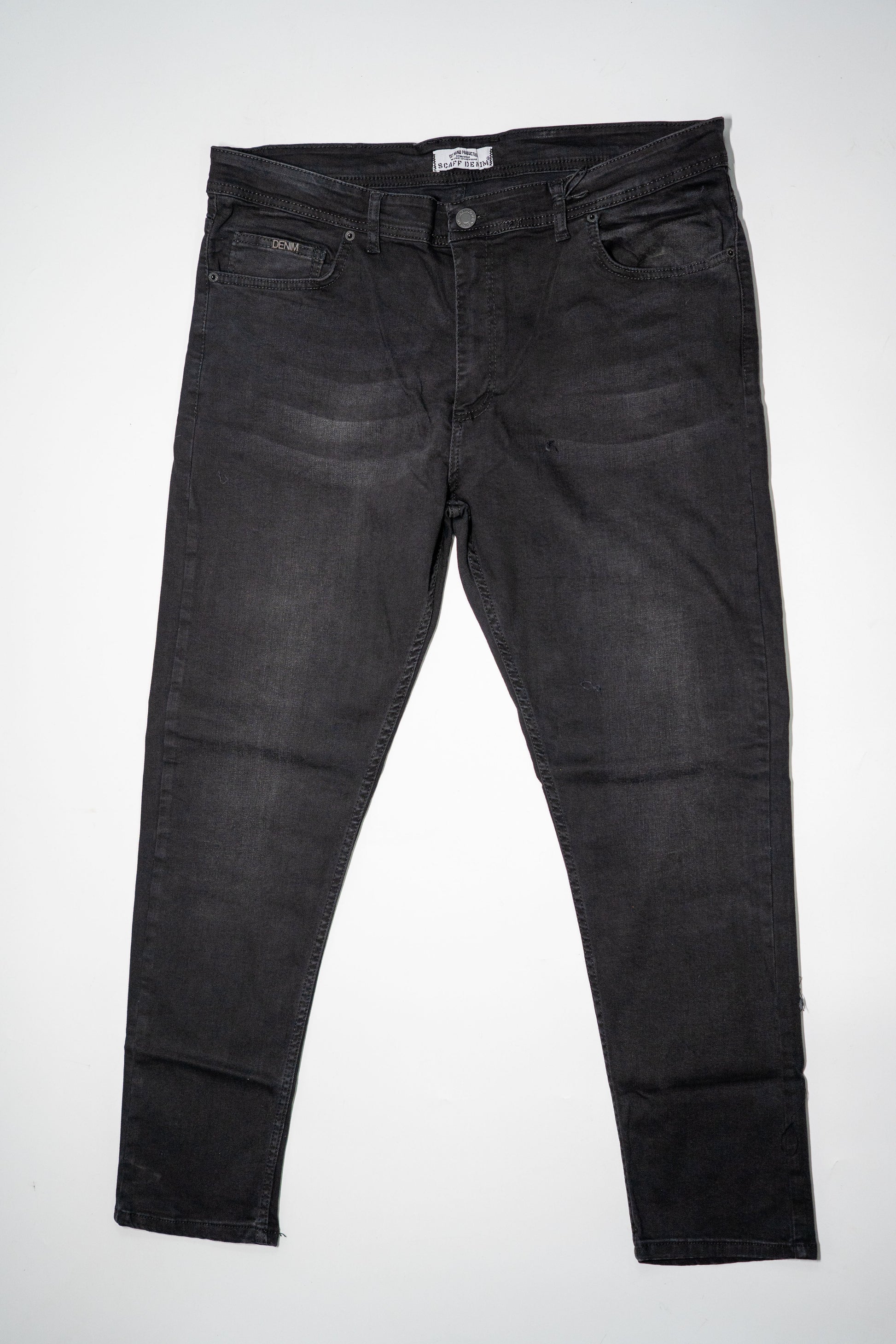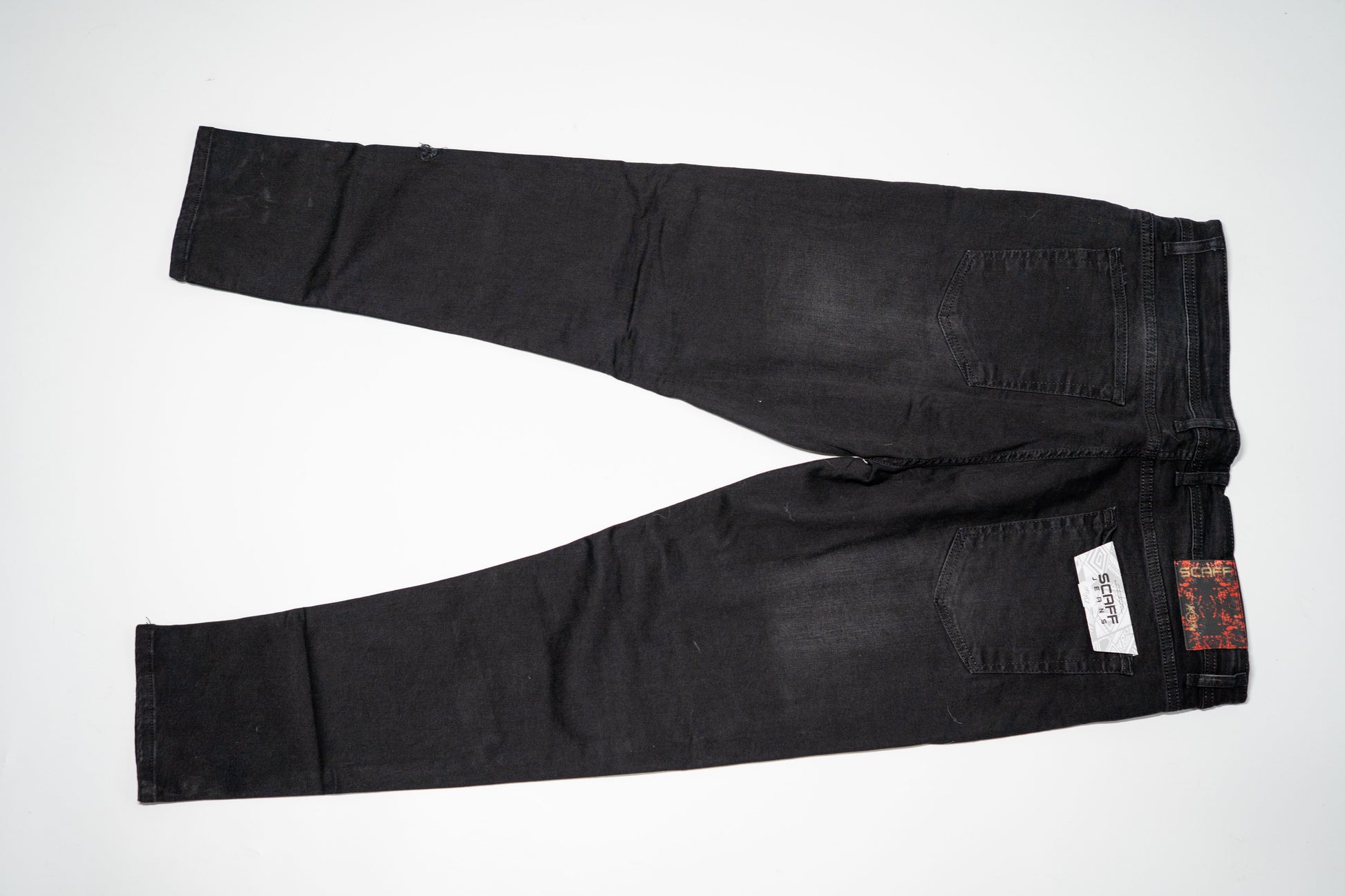Material denim negru cu finisaj estompat, ce adaugă profunzime și caracter.