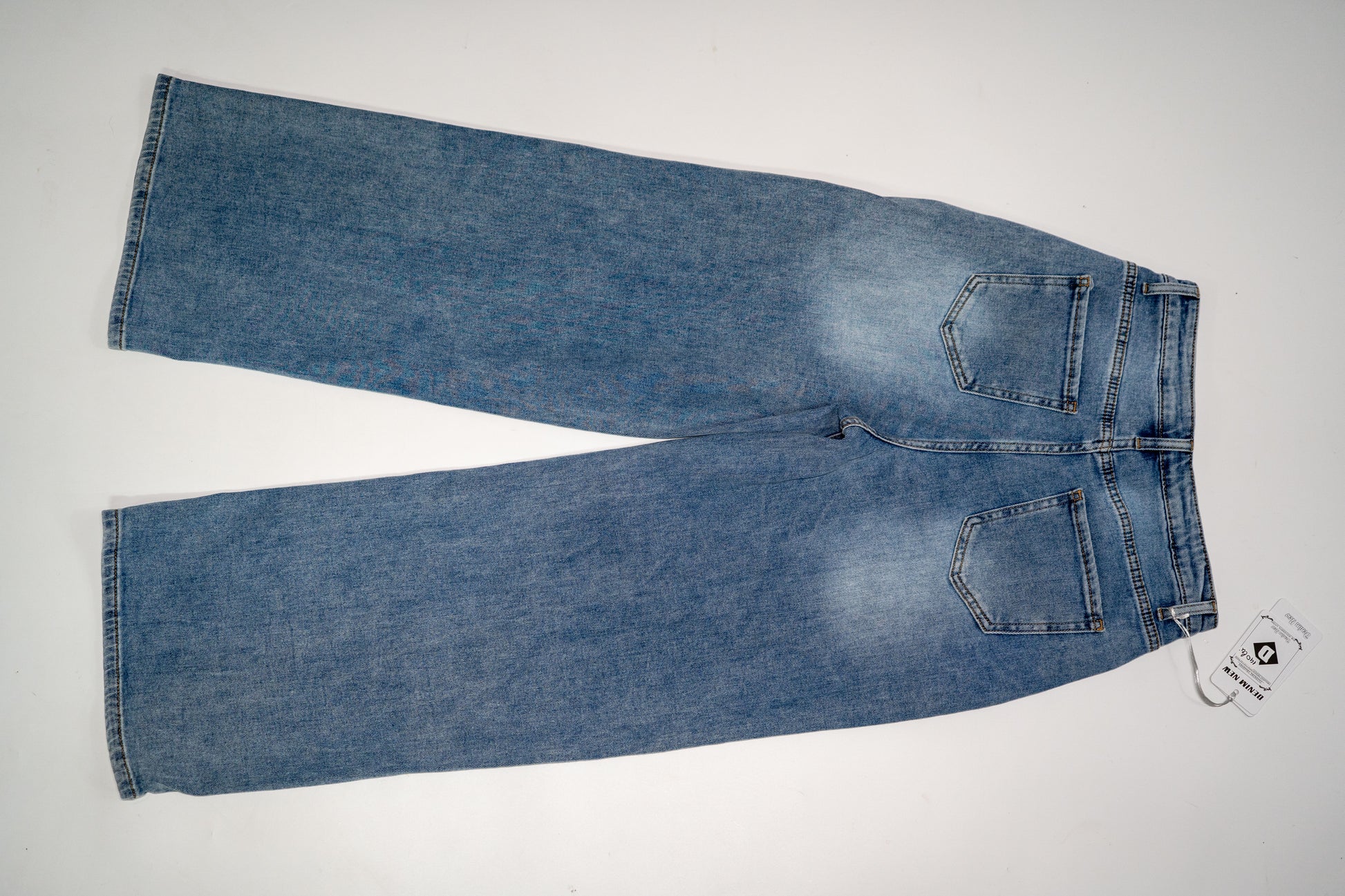 Denim albastru cu efect de spălare concentrat în zona coapselor și genunchilor, pentru un look autentic.