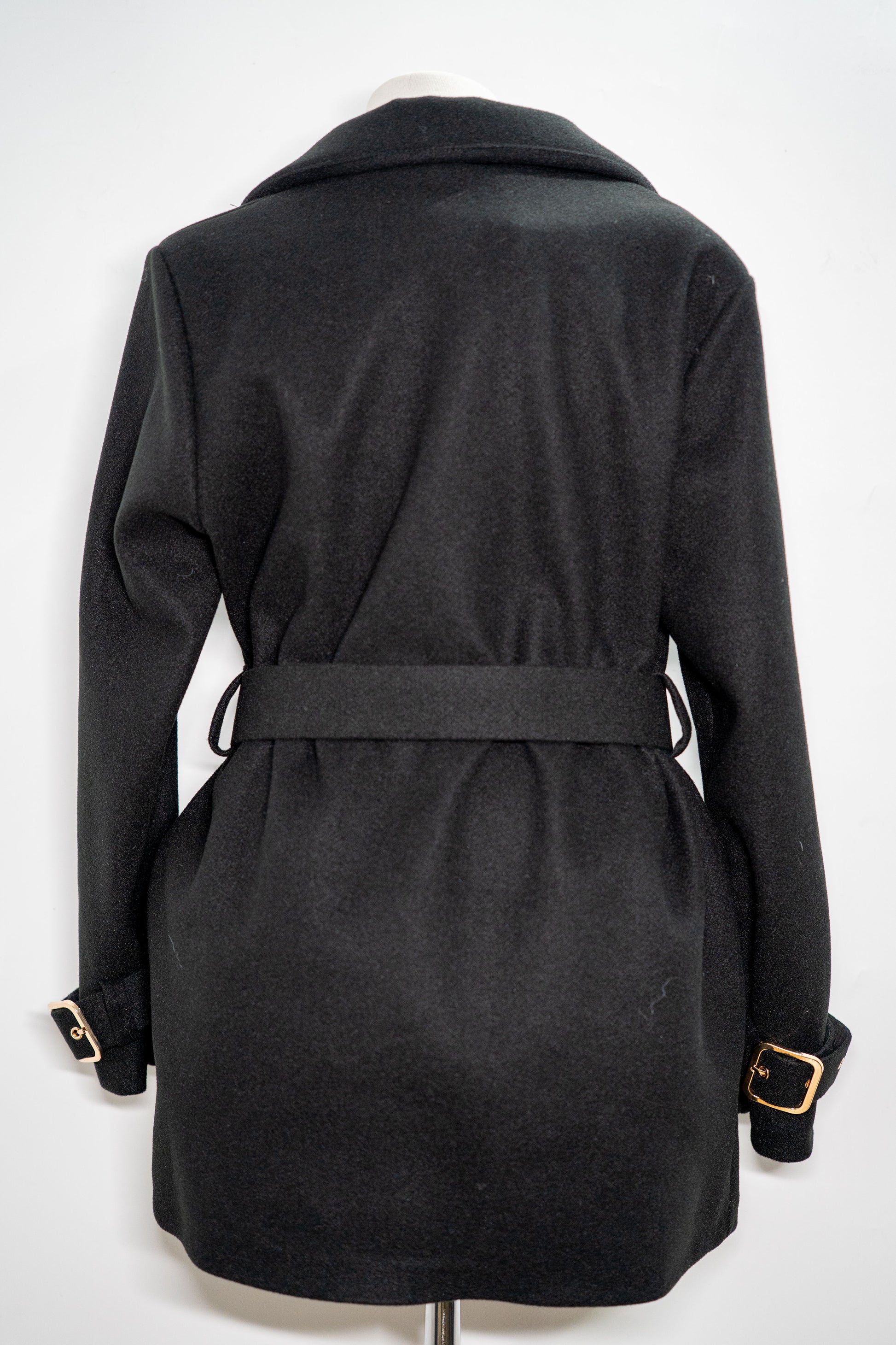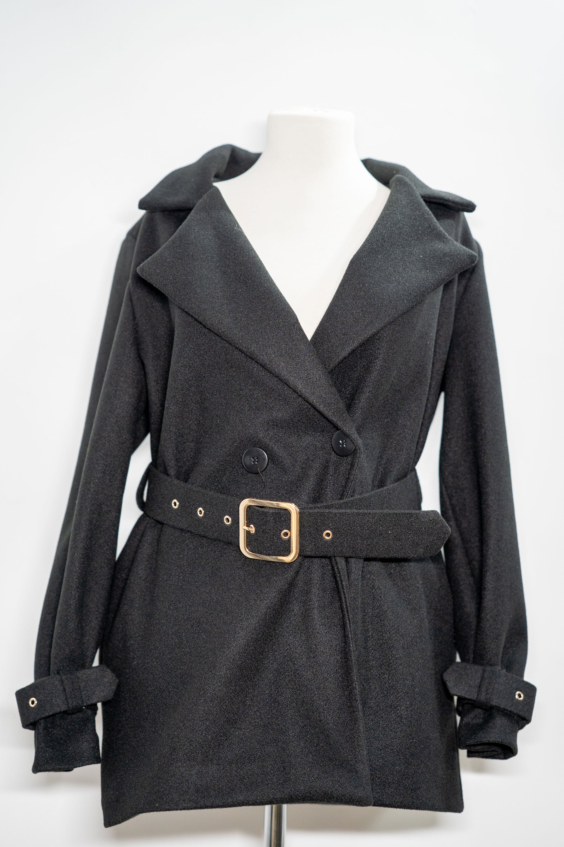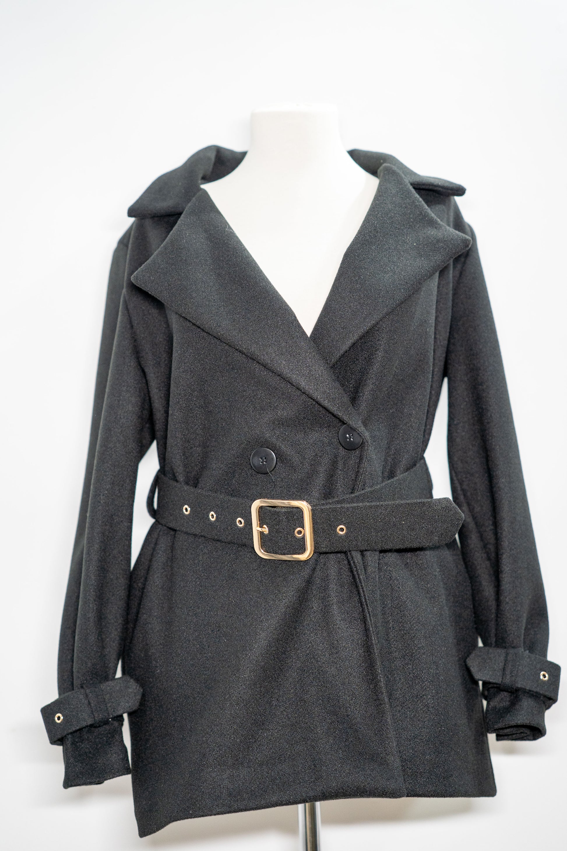 Transformă fiecare apariție într-o declarație de stil cu acest palton scurt într-un negru profund, atent croiat pentru femeia modernă, care îmbină eleganța cu încrederea. Designul său trench double-breasted, completat de gulerul amplu și liniile curate, conturează o siluetă sofisticată și atemporală.