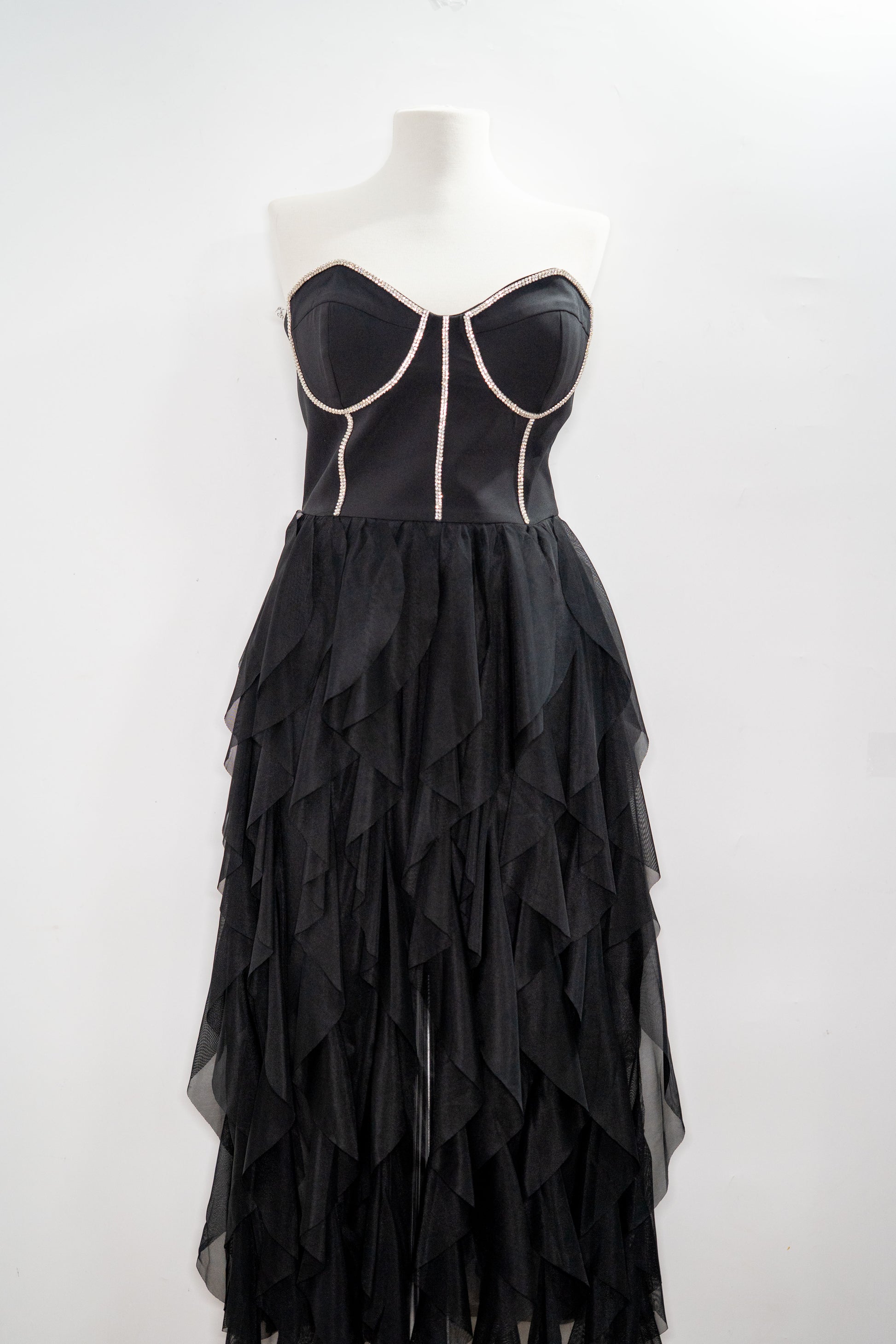 Dramatism textural și eleganță arhitecturală într-o piesă statement. Rochia elegantă Black Sculpt este o apariție îndrăzneață și sofisticată, creată pentru momente în care silueta devine sculptură și detaliile definesc luxul. Cu un bust structurat decorat cu linii metalice și o fustă asimetrică din straturi fluide, această piesă adaugă un aer couture și teatral oricărei ținute de gală.