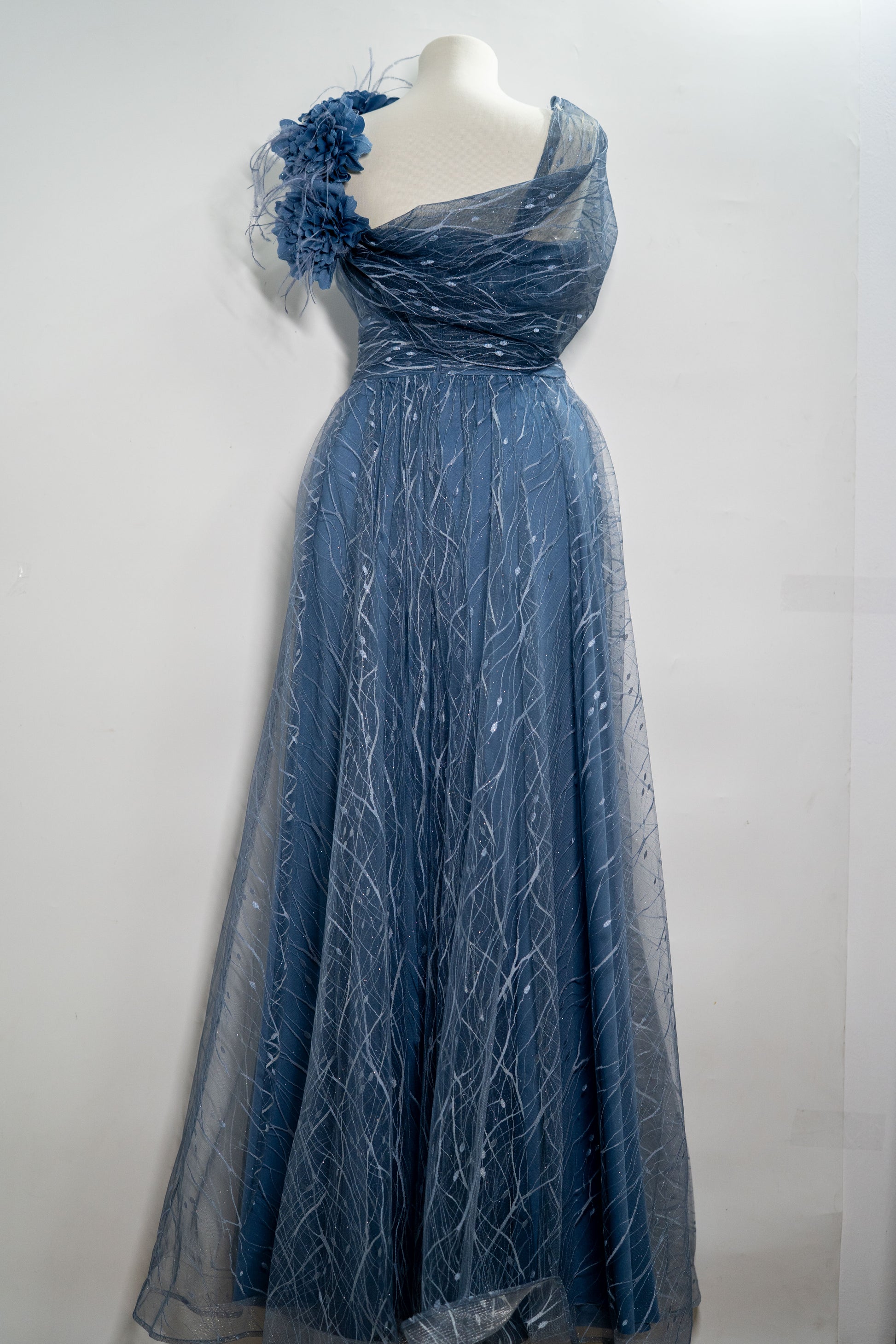 Grație, volum și detalii artistice într-o piesă de gală. Rochia elegantă Blue Bloom este o apariție spectaculoasă, creată pentru momente memorabile. Cu o croială fluidă, broderie delicată și o floare supradimensionată aplicată pe umăr, această rochie adaugă un aer poetic și sofisticat oricărui eveniment special.