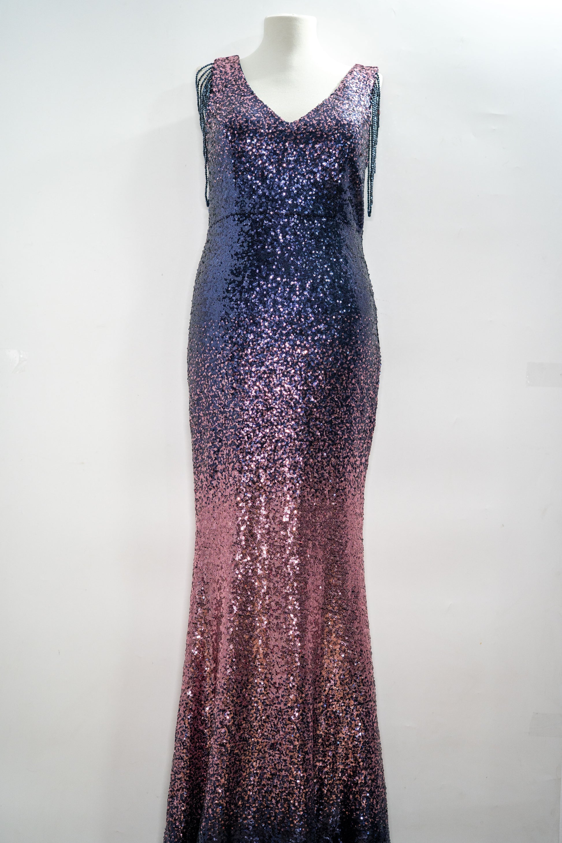 Strălucire fluidă și culoare în tranziție într-o piesă de seară spectaculoasă. Rochia elegantă Twilight Cascade este o apariție hipnotică, creată pentru momente în care lumina, mișcarea și culoarea se îmbină într-un spectacol vizual. Cu un design în degrade de la bleumarin la roz pal, franjuri strălucitoare și o croială fluidă, această piesă adaugă un aer glam și sofisticat oricărei ținute de gală.