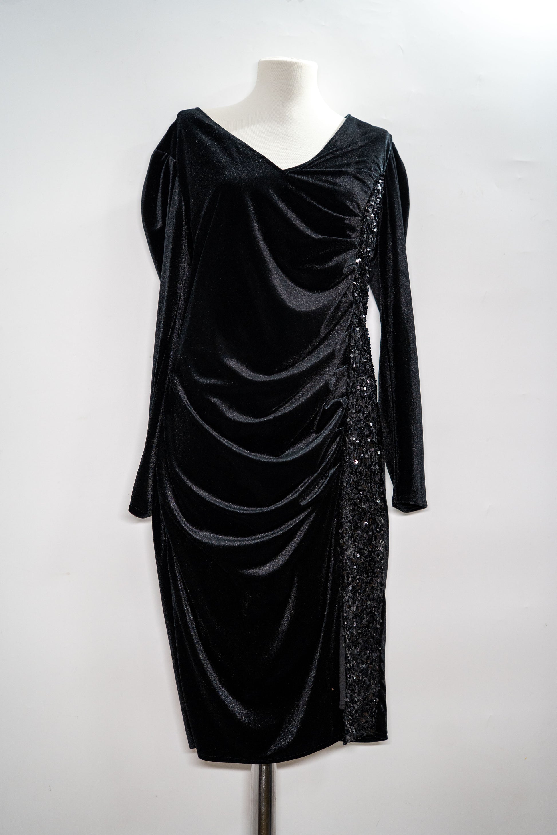 Texturi contrastante și eleganță sculpturală într-o piesă de seară. Rochia elegantă Velvet Spark este o apariție sofisticată, creată pentru momente în care rafinamentul se exprimă prin detalii subtile și materiale prețioase. Cu o croială cambrată, drapaj frontal și inserție verticală cu paiete, această piesă adaugă un aer misterios și strălucitor ținutelor de gală.