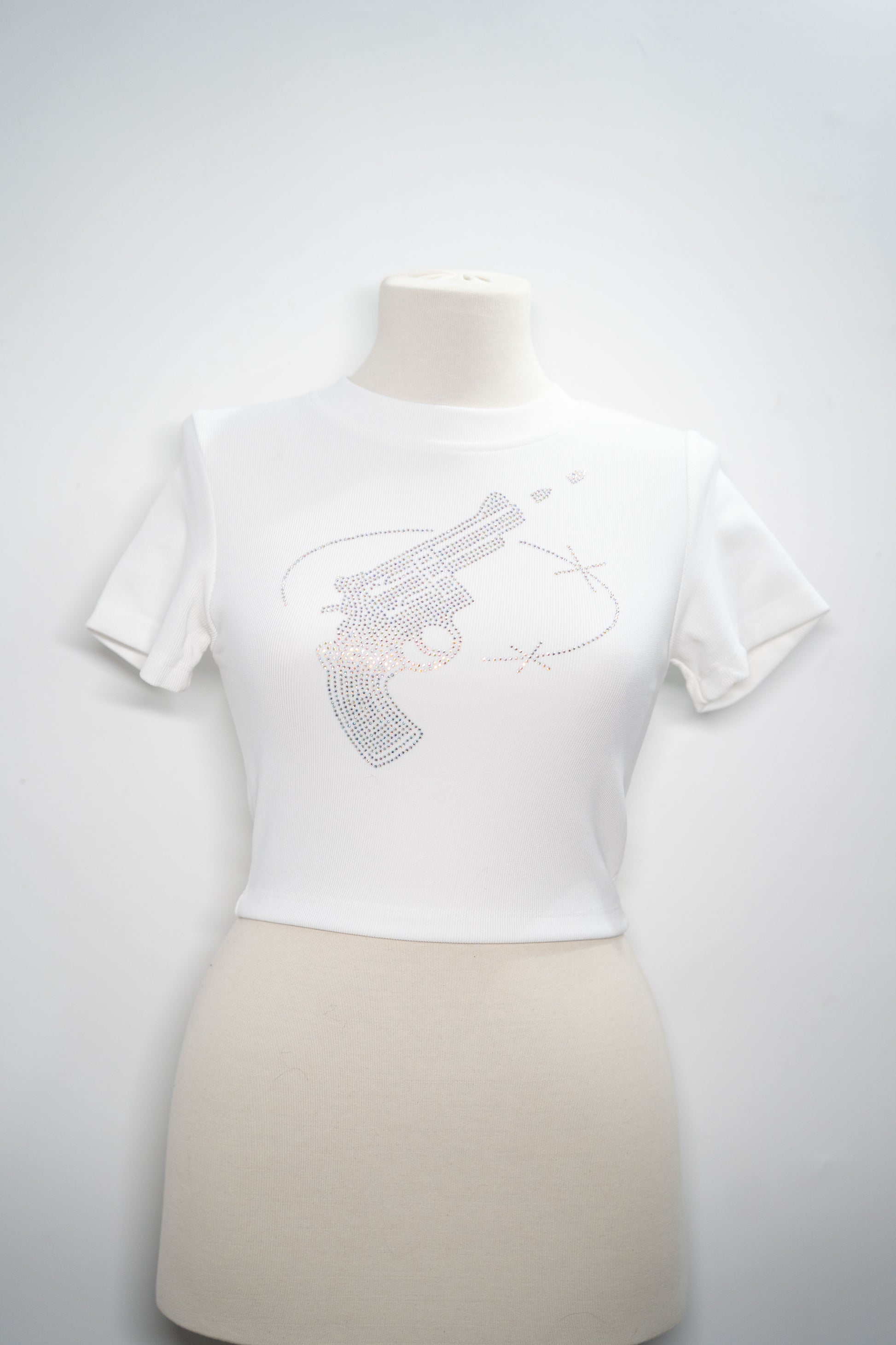 Provocare vizuală și stil urban într-o singură piesă. Topul Crystal Revolver este o alegere îndrăzneață pentru femeia care transformă fiecare apariție într-o declarație de atitudine. Cu un design din pietre strălucitoare ce formează o armă stilizată, această piesă combină estetica glam cu influențe streetwear.